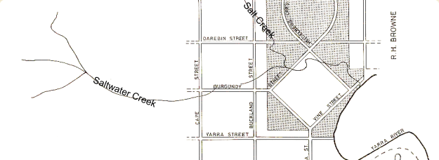 Evidence of Heidelberg's natural drainage emerges from time to time, when parts of Burgundy Street flood, especially near the Sir Henry Barkly Hotel and the shop or cafe opposite on the north west corner of Cape Street. A creek appears to rise in a small park to the south of the Austin Hospital, and this creek now flows mainly underground, along the line of Burgundy Street, crossing Rosanna Road just north of Burgundy Street and continuing in a blue stone paved course until it meets Salt Creek in Heidelberg Park. It's name is Saltwater Creek. The combined creeks either trickle or flow more strongly under Burgundy Street and into the Yarra.