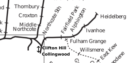 "Collingwood" was on the site of the modern Victoria Park station. After arriving at Collingwood, the train would then have to go back the other way, through Clifton Hill again, to Northcote South (Westgarth), and on to Heidelberg. The change of direction at Collingwood could be a slow process, with shunting and repositioning of the engine.