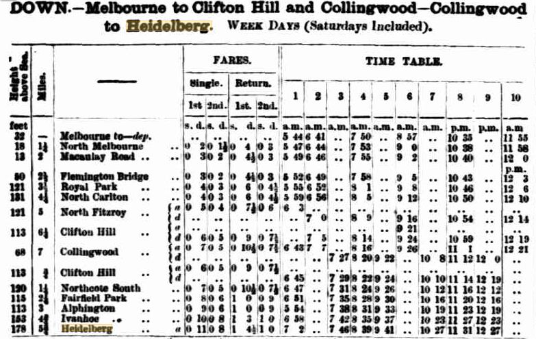 Also of interest are the fares, single and return, first and second class. A first class return between Melbourne and Heidelberg was one shilling and four pence halfpenny.