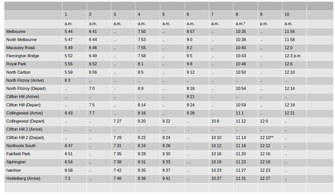 Many of the times given appear to be over optomistic. Trains such as number 11, which left Collingwood at 12.58pm and left Clifton Hill at 1.00pm were only given 2 minutes for this process, which included travelling between the stations, stopping at Clifton Hill and allowing passengers to get on and off, and starting up again. The same time of 2 minutes was allowed for trains to leave Clifton Hill, cross the Merri Creek bridge, arrive at Northcote South, embark and disembark passengers, and get rolling again. This seems unlikely with the trains of 1890.