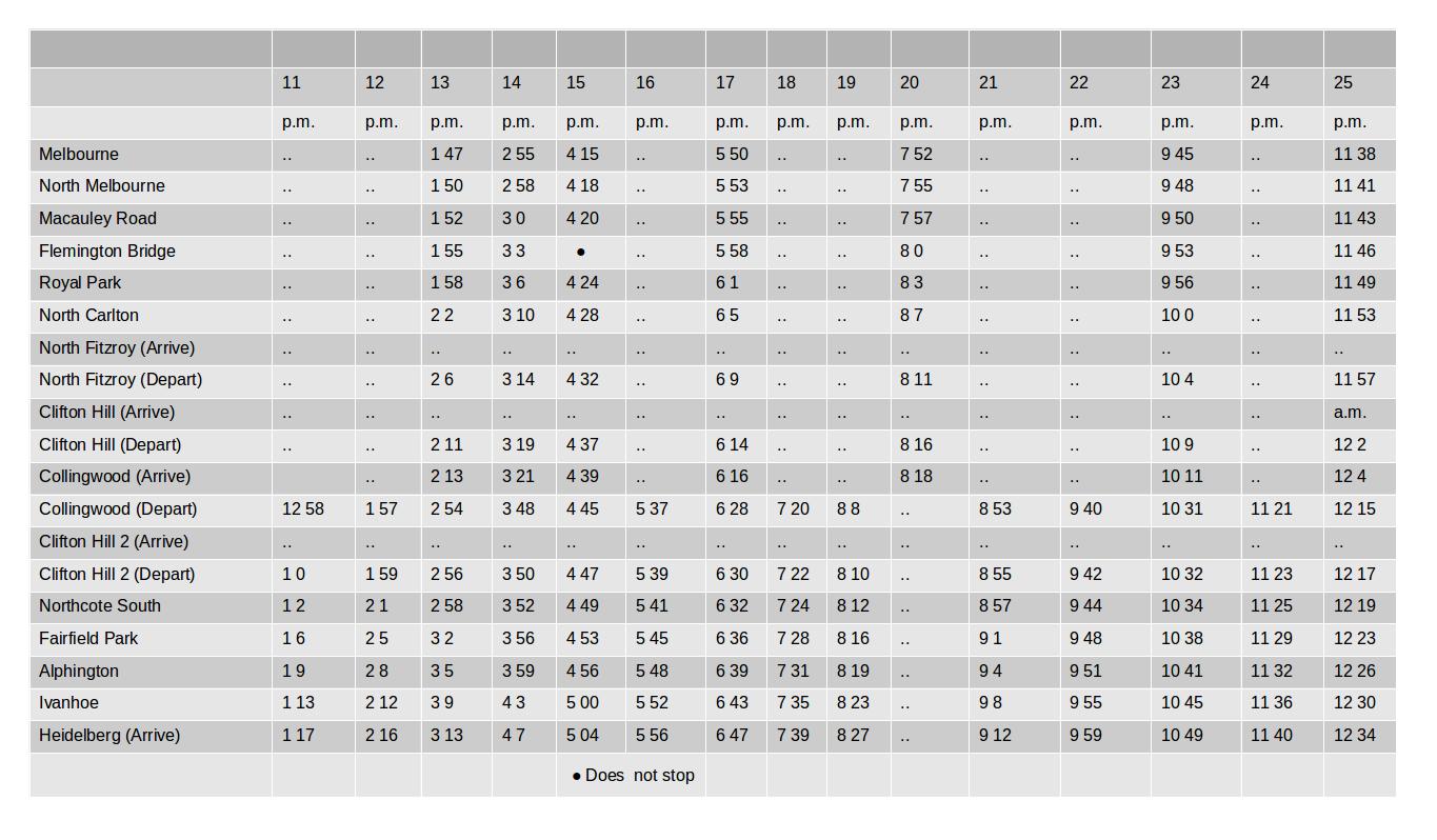 Then there were trains that went to Collingwood and terminated there; for example, train number 6 on the timetable was shown as leaving Melbourne at 8.57am and terminating at Collingwood at 9.26 am. It didn't go on to Heidelberg.