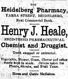 Mr Heale, pharmaceutical chemist and druggist, had an interesting range of goods. As well as tending to your health, he sold seeds, trees, horse and cattle medicine, and he could pull or fill your teeth.